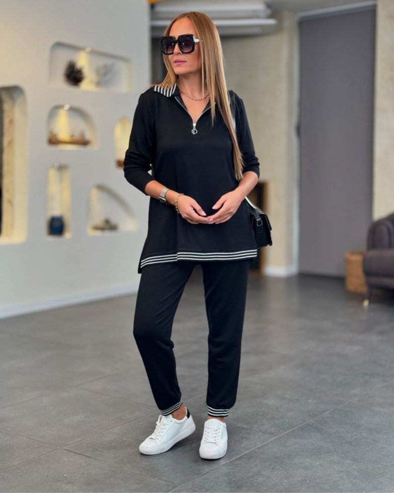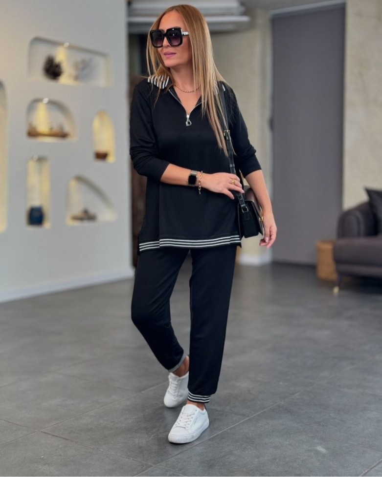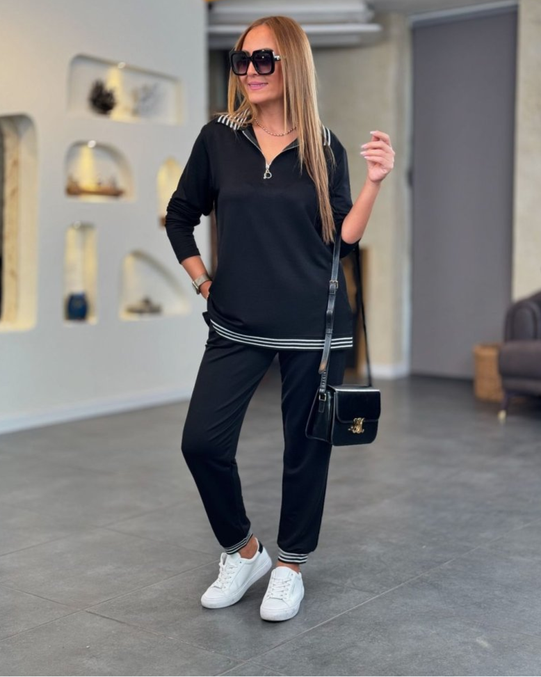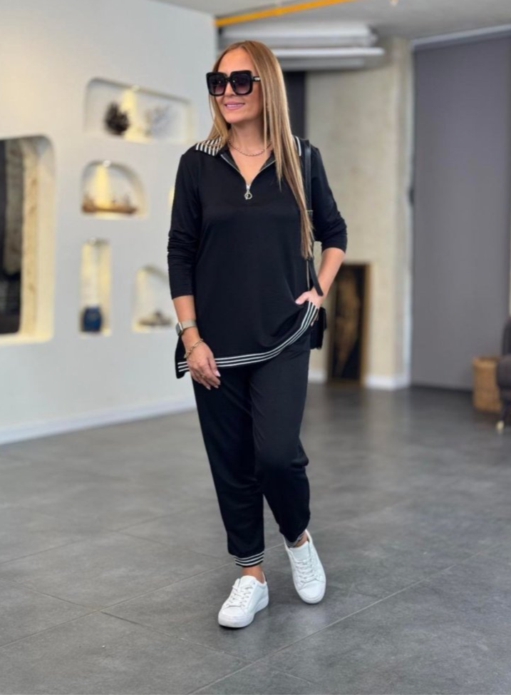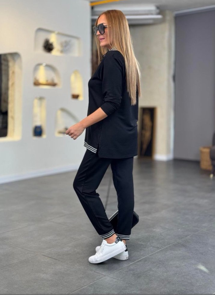 Sade şıklığın en rahat hali! Ribana detaylarıyla hareket kazandırılmış bu ikili takım, gün boyu konforu zarafetle buluşturur. Esnek iki iplik kumaşı sayesinde formunu korur, her bedende rahat bir duruş sağlar. Beyaz spor ayakkabılarla kombinlendiğinde sportif, topuklu ayakkabılarla kombinlendiğinde ise zarif bir stil sunar.